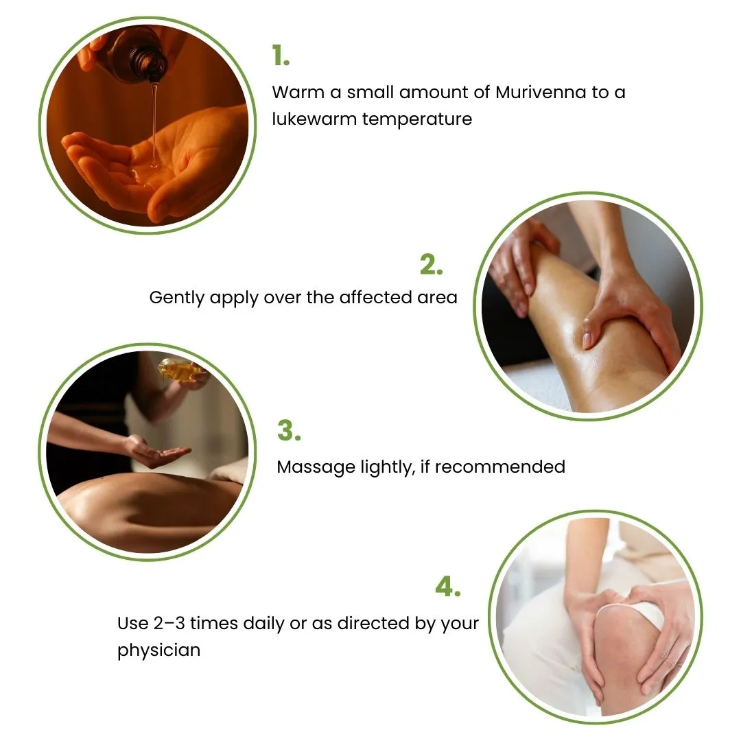 Murivenna is traditionally used for sprains, swelling, muscle pain, joint stiffness, and minor injuries. It helps soothe inflammation and support faster healing.