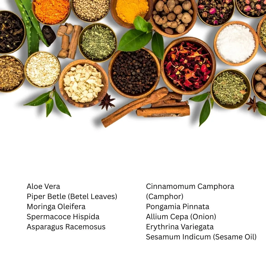 1. Aloe Vera 2. Piper Betle (Betel Leaves) 3. Moringa Oleifera 4. Spermacoce Hispida 5. Asparagus Racemosus 6. Cinnamomum Camphora (Camphor) 7. Pongamia Pinnata 8. Allium Cepa (Onion) 9. Erythrina Variegata 10. Sesamum Indicum (Sesame Oil)